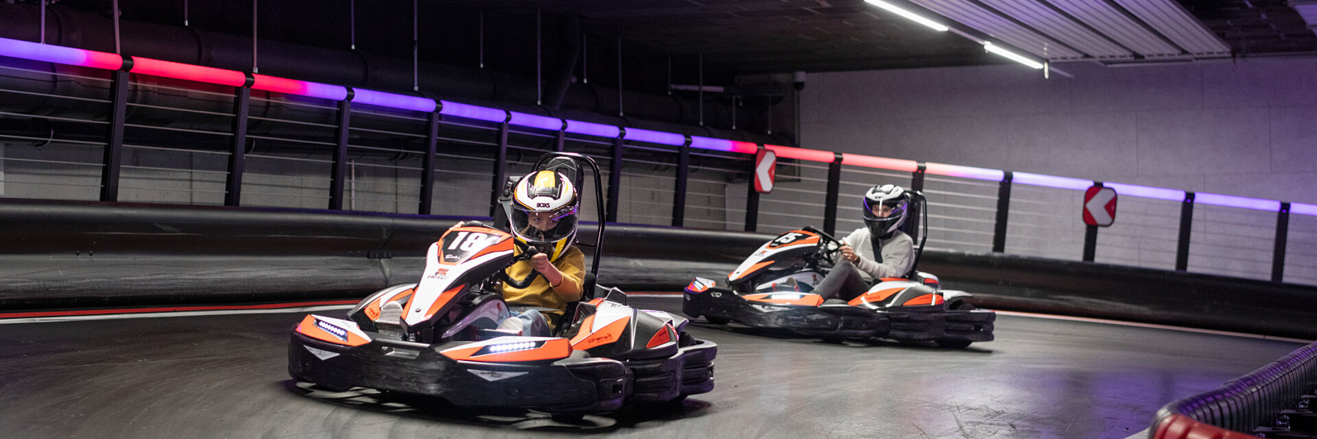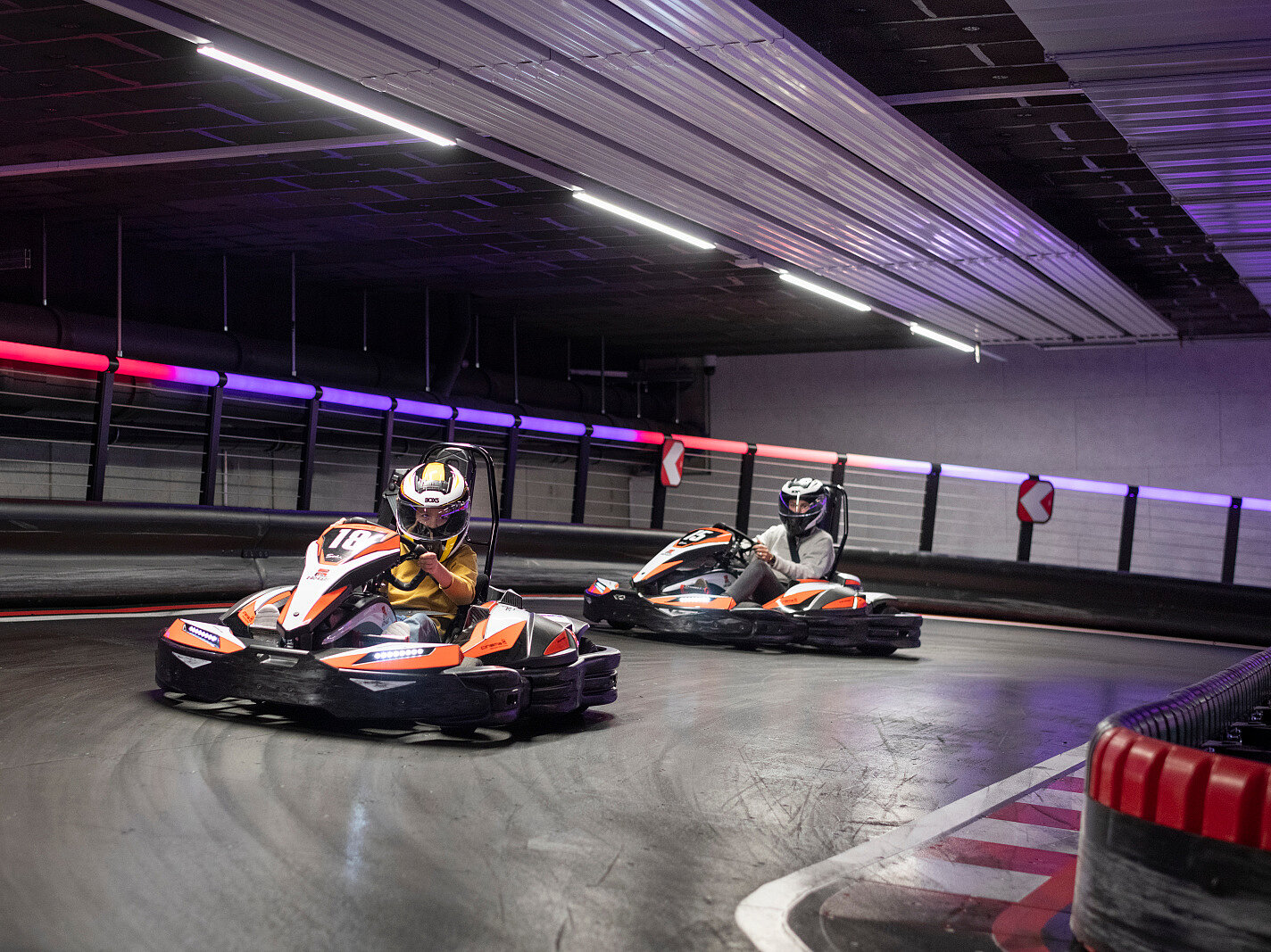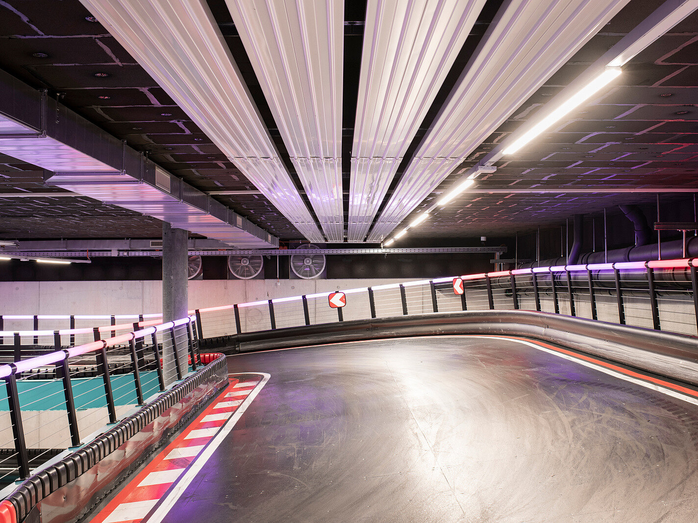In der weitläufigen Fabrikhalle wurde im Untergeschoss eine doppelstöckige E-Kartbahn installiert, um den Besuchern ein aufregendes Fahrerlebnis zu bieten. Eine grosse Installationsfläche ermöglicht eine behagliche Beheizung der voluminösen Räumlichkeiten. Das warme Wasser durchströmt die Deckenstrahlplatten und heizt den grossen Raum energieeffizient.