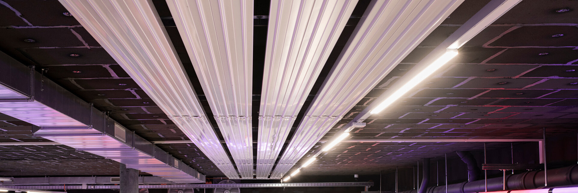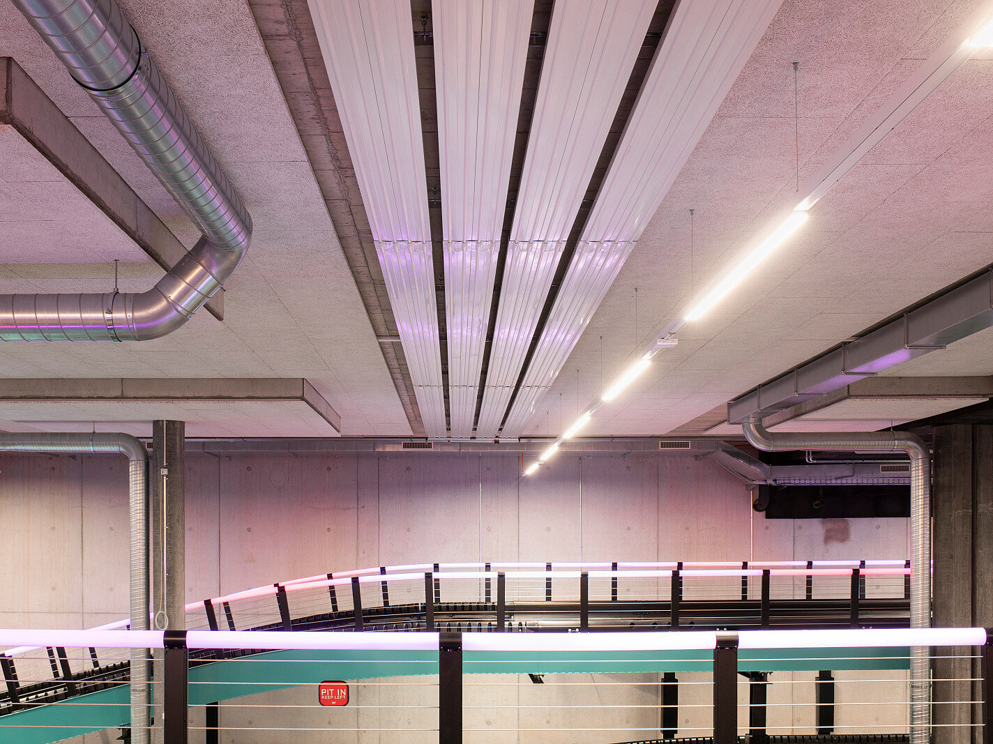 Die Zehnder Deckenstrahlplatten sind im Betrieb so leise wie die Elektrokarts. Dies beeinflusst die Akustik in grossen Räumen positiv und schafft ein angenehmes Raumgefühl. Diskret eingebaut und auf das Raumkonzept abgestimmt verleihen die Heizelemente der Rennbahn einen urbanen Look.
