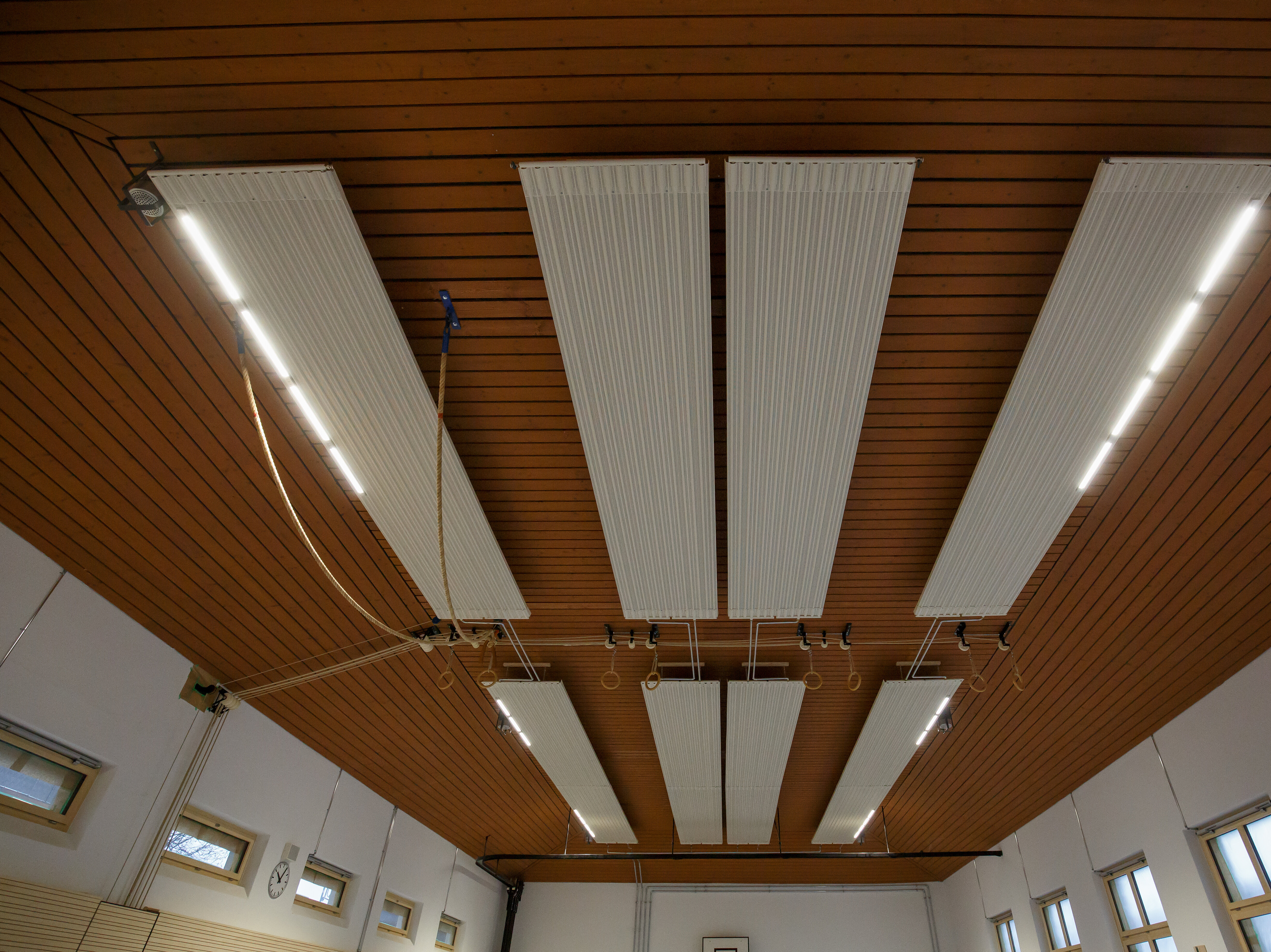 Die Sanierung der Turnhalle war mit einer umfassenden Erneuerung der Gebäudetechnik und der Verbesserung der Gebäudedämmung verbunden, soweit dies aus bauphysikalischer Sicht möglich und sinnvoll war. Um die gesteckten Ziele hinsichtlich Wärme, Beleuchtung, Sicherheit und Effizienz zu erreichen, hat sich die Bauherrschaft für die Deckenstrahlplatten von Zehnder entschieden.